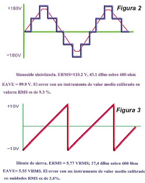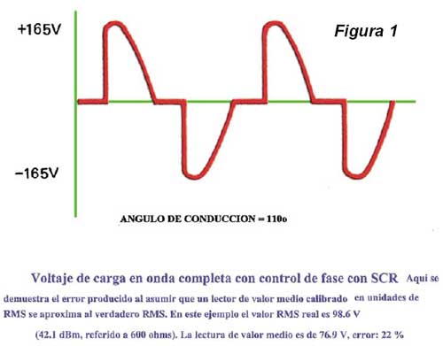 armónicas. Los instrumentos rectificadores y electrónicos se utilizan de ordinario de modo que no siguen la ley cuadrática, las particularidades de tal funcionamiento se discuten a continuación. Es así, que la mayoría de los instrumentos de CA sólo miden el verdadero valor eficaz de una señal cuando la misma es una sinusoide perfecta. Para el técnico que hace la medición, el problema es reconocer que cantidad es la que realmente se mide. La diferencia entre lo que el operador cree que está midiendo y el parámetro que está realmente midiendo puede llevar a errores importantes. Esto es especialmente importante cuando se está trabajando con las exactitudes comunes a los instrumentos digitales. Las figuras 1 a 3 muestran las discrepancias entre los valores eficaces reales y los valores medios que responden a los valores calibrados en unidades RMS para mediciones típicas. |