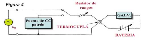 dentro del rango efectivo de la termocupla. 2- Un voltaje, proporcional al valor RMS de la corriente CA se genera en la juntura de la termocupla. Esta salida provoca la deflexión del galvanómetro, el que se lleva a cero mediante el ajuste de la batería. 3- La fuente de CC calibrada se conmuta ahora en lugar de la entrada de CA, y se varía hasta llevar el galvanómetro a cero. El valor de la tensión de continua es ahora igual al valor RMS de la señal de CA. |