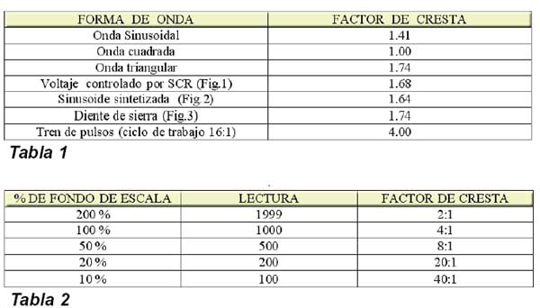 frecuencia ante que al verdadero valor RMS. A menudo uno está interesado en conocer la exactitud de una medición con un instrumento de verdadero valor eficaz sobre una forma de onda específica. El factor de cresta del instrumento es la clave para la respuesta a dicha pregunta. Ningún instrumento medirá con exactitud el valor RMS de todas las formas de onda. La especificación del factor de cresta describe al conjunto de formas de onda para la cual el instrumento hará medidas dentro de la exactitud especificada. Obviamente, un instrumento que responde al valor medio no puede tener una especificación del valor de cresta, ya que dicho instrumento puede medir con exactitud una sola forma de onda, la senoidal. El factor de cresta se define como la relación entre el valor pico y el RMS de una forma de onda. Un instrumento con un valor de cresta de 4:1 medirá con la exactitud especificada todas las señales con un factor de cresta menor que 4:1. Los factores de cresta de algunas de las formas de onda que se encuentran en la práctica son los dados en la tabla 1. Estos ejemplos indican que las formas de onda más comunes poseen un factor de cresta relativamente bajo. Las formas de onda con paquetes de energía, como trenes de pulsos con un ciclo de trabajo muy bajo, tiene una relación de pico a RMS muy alta, y solamente pueden ser medidas con exactitud con instrumentos con un alto factor de cresta. |