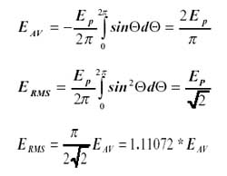 es mejor a media escala que a plena escala. La tabla 2 es típica. La técnica del valor medio ofrece buena estabilidad, buena sensibilidad y mediciones relativamente rápidas a un precio económico. Su economía y efectividad ha hecho que se emplee en la mayoría de los tésters digitales. Los instrumentos de valor medio serían mucho más populares si no fuera por el hecho de que pequeñas desviaciones de una sinusoide puede ocasionar errores importantes. Estos son causados por la distorsión resultado de la naturaleza de la técnica. Lo que realmente se mide es el valor medio rectificado de la señal de CA y luego se muestra el valor sobre una escala calibrada en el equivalente RMS. El punto crucial es que la calibración está basada en la relación matemática precisa entre el valor medio y el valor RMS de una onda sinusoidal sin distorsión. Matemáticamente: |