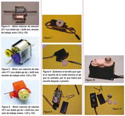 En los juguetes deltipo Mecano o Lego, podemos encontrarmotores con reductores o sistemasreductores para acoplar a losmotores. Esta es una buena opción sise dispone de ellos, en caso contrario,existen en el mercado motoresreductores como los que se muestranen la siguiente tabla con figuras,que además de disminuir la velocidadle dan más potencia al microbotpara mover por su estructura y la batería(que proporcionalmente pesamucho) y otros objetos para lo cualse necesita disponer de motores conbuen par de arranque. En las figuras3 a 6 podemos observar diferentes tiposde motores.